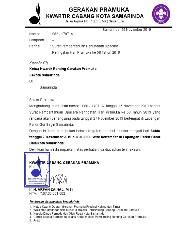 Surat Penundaan Upacara Pramuka Kwarcab Samarinda